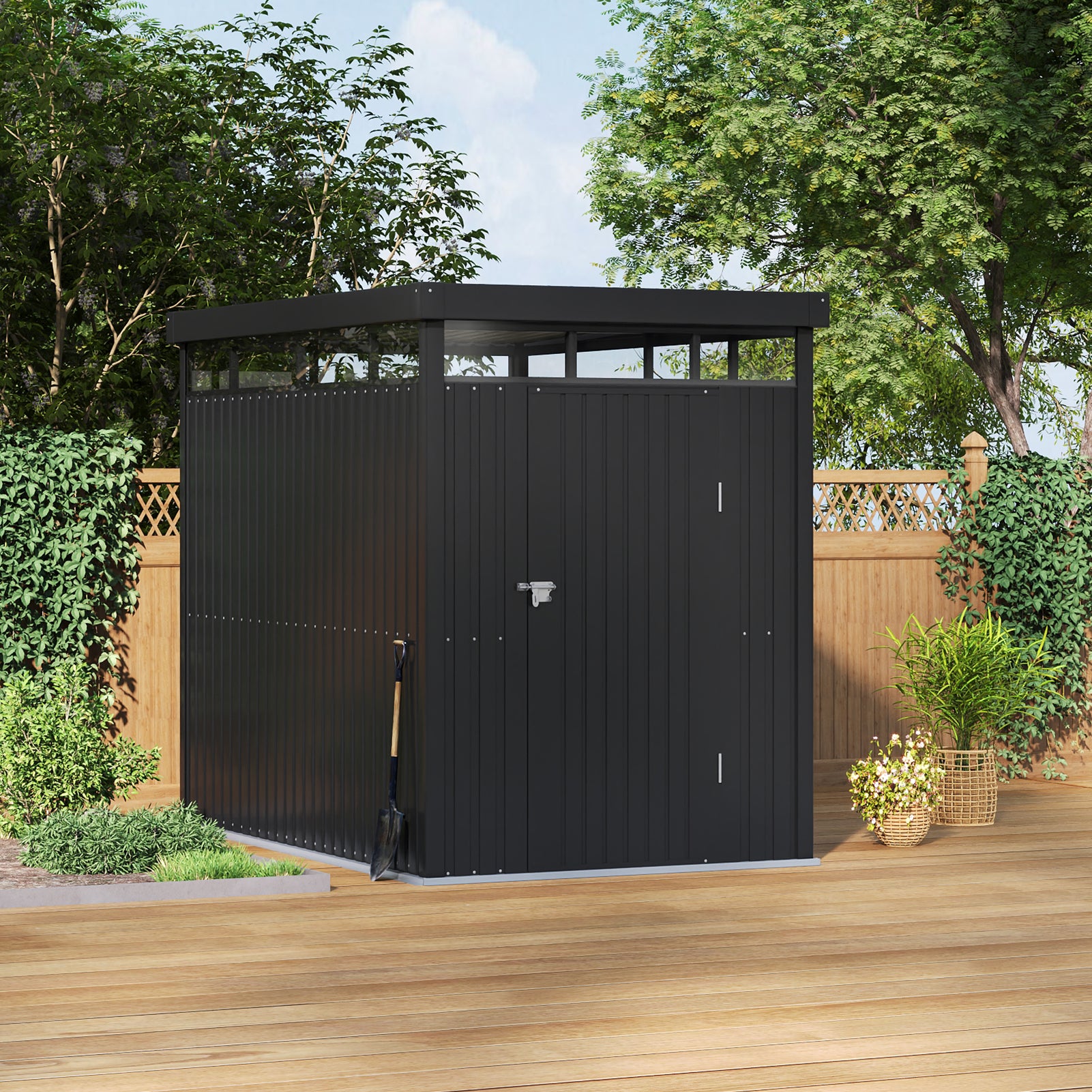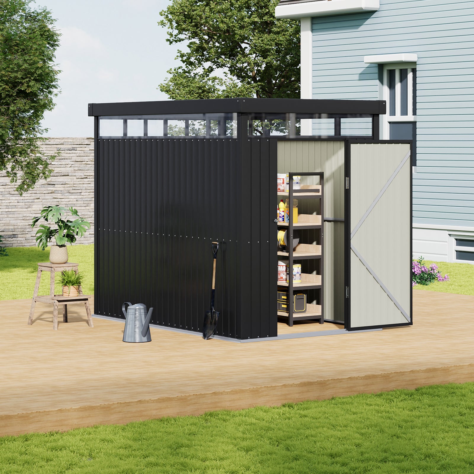 This expertly crafted garden storage shed combines functionality with an elegant design. Made from color-coated steel and galvanized panels, it ensures robust protection against rust and harsh weather conditions. Its sleek modern design, highlighted by vertical paneling and a flat roof, fits seamlessly into any outdoor environment. Inside, a spacious interior offers ample room to neatly store gardening tools, outdoor gear, and maintenance supplies. Transparent acrylic windows at the top provide natural light, making it easier to find items. Ideal for daily use, this shed enhances tool accessibility and optimizes workspace organization.