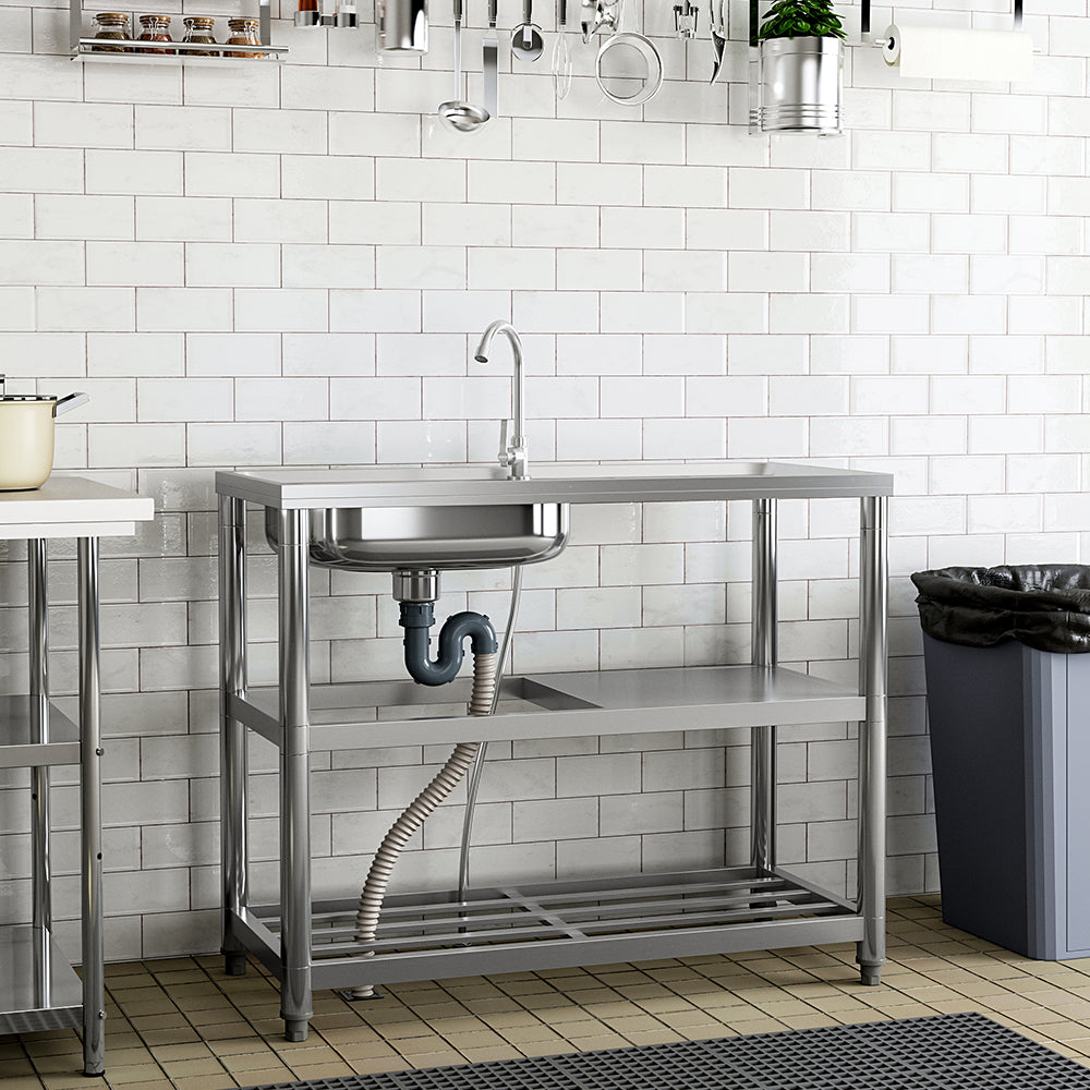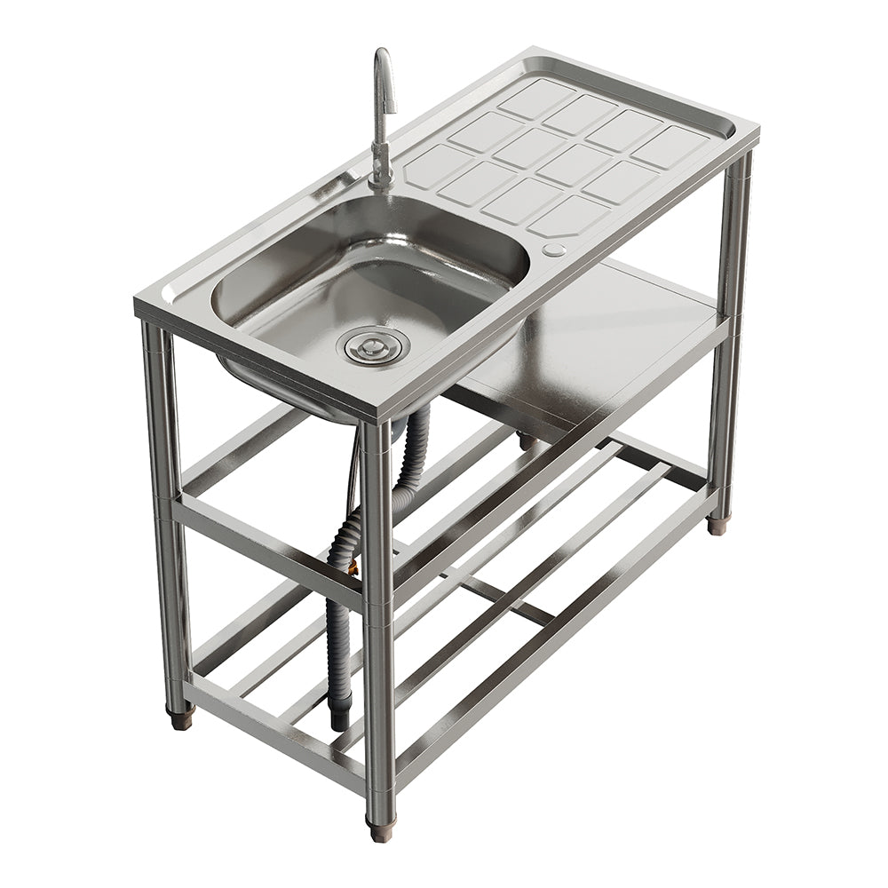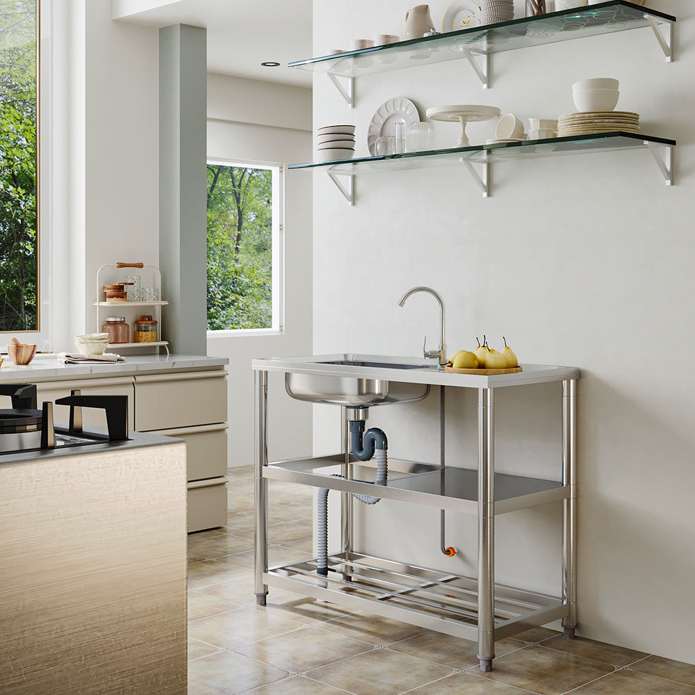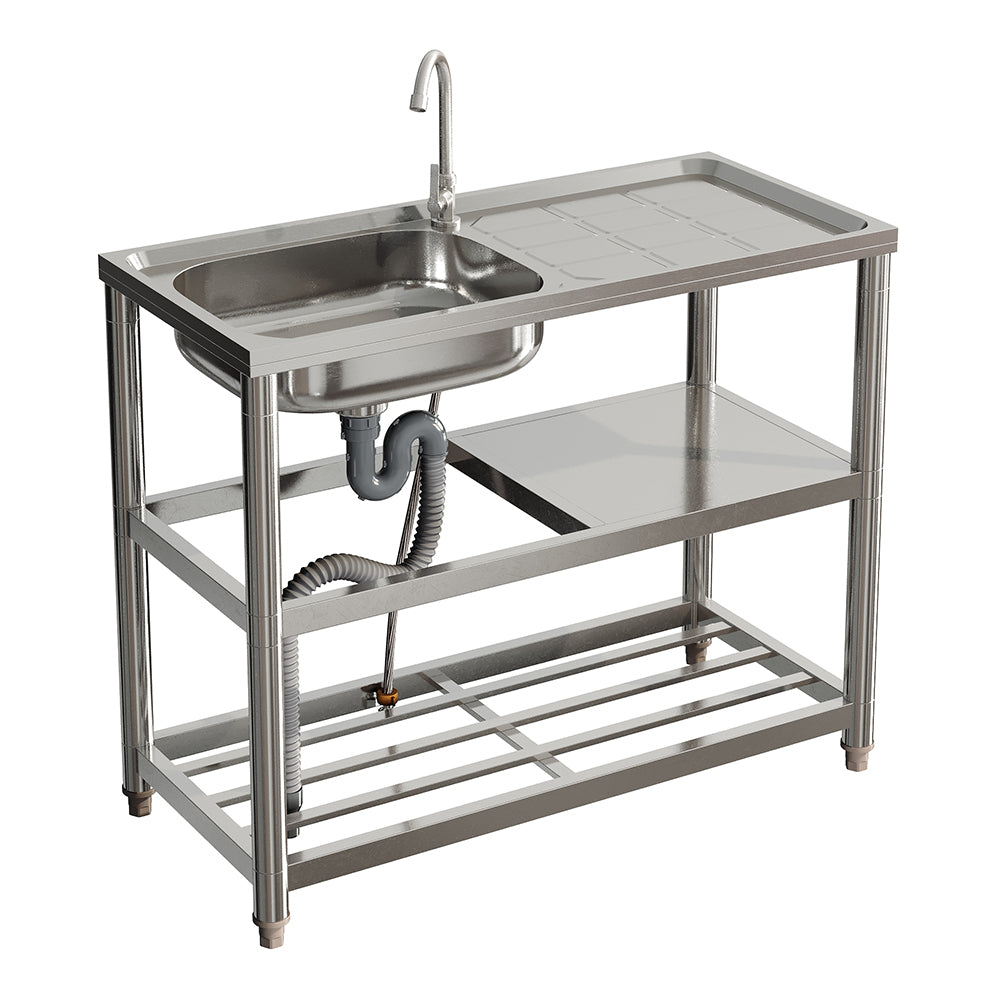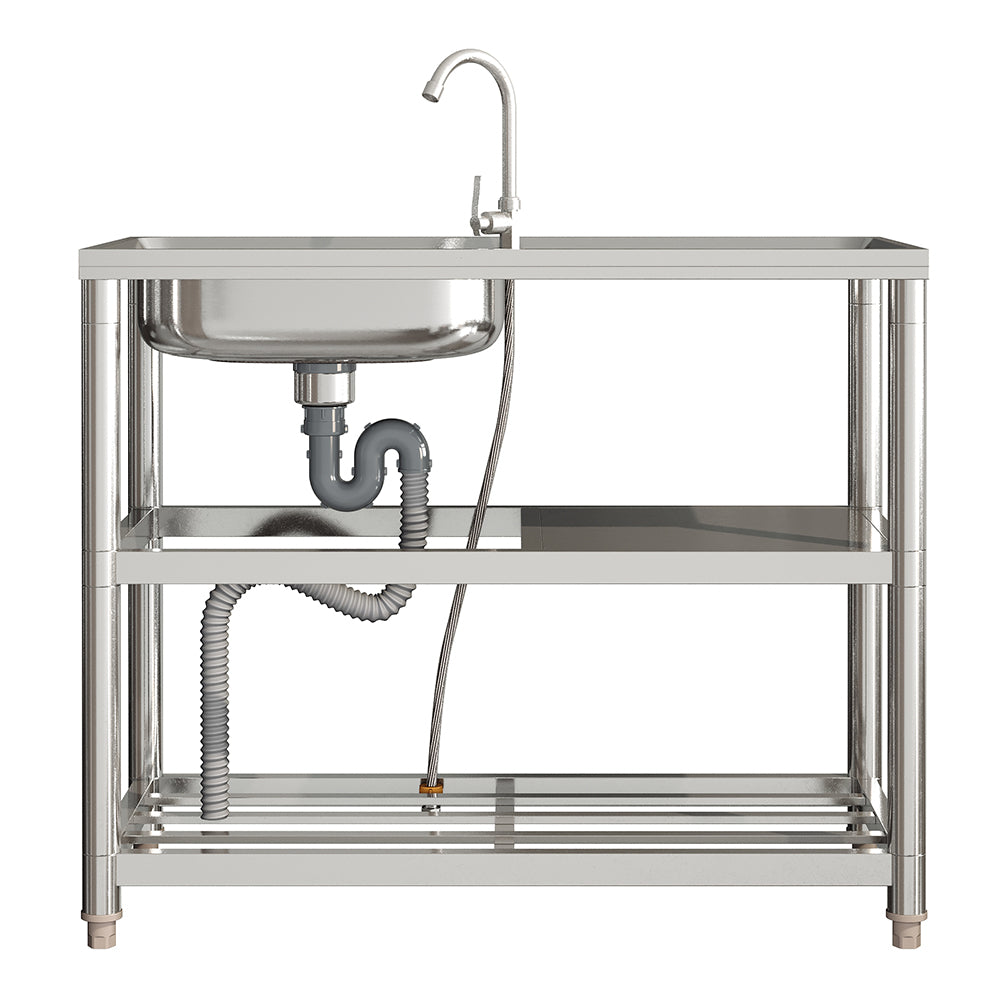 Upgrade your kitchen with the Stainless Steel Sink, designed for durability and functionality. Made from high-quality stainless steel, it resists corrosion and stains, ensuring long-lasting performance. This single-basin sink includes dual tap holes and an integrated drainboard for convenient dish drying. Beneath the basin, double-tiered shelves provide generous storage for cleaning supplies and kitchen essentials, maximizing space and enhancing workflow in any kitchen environment.