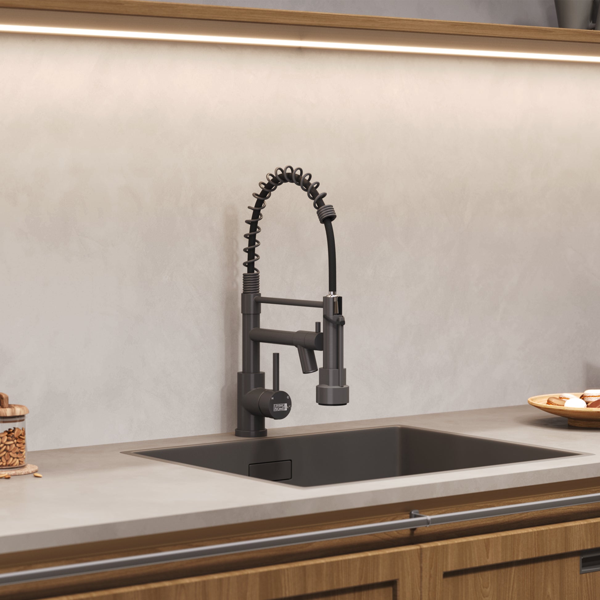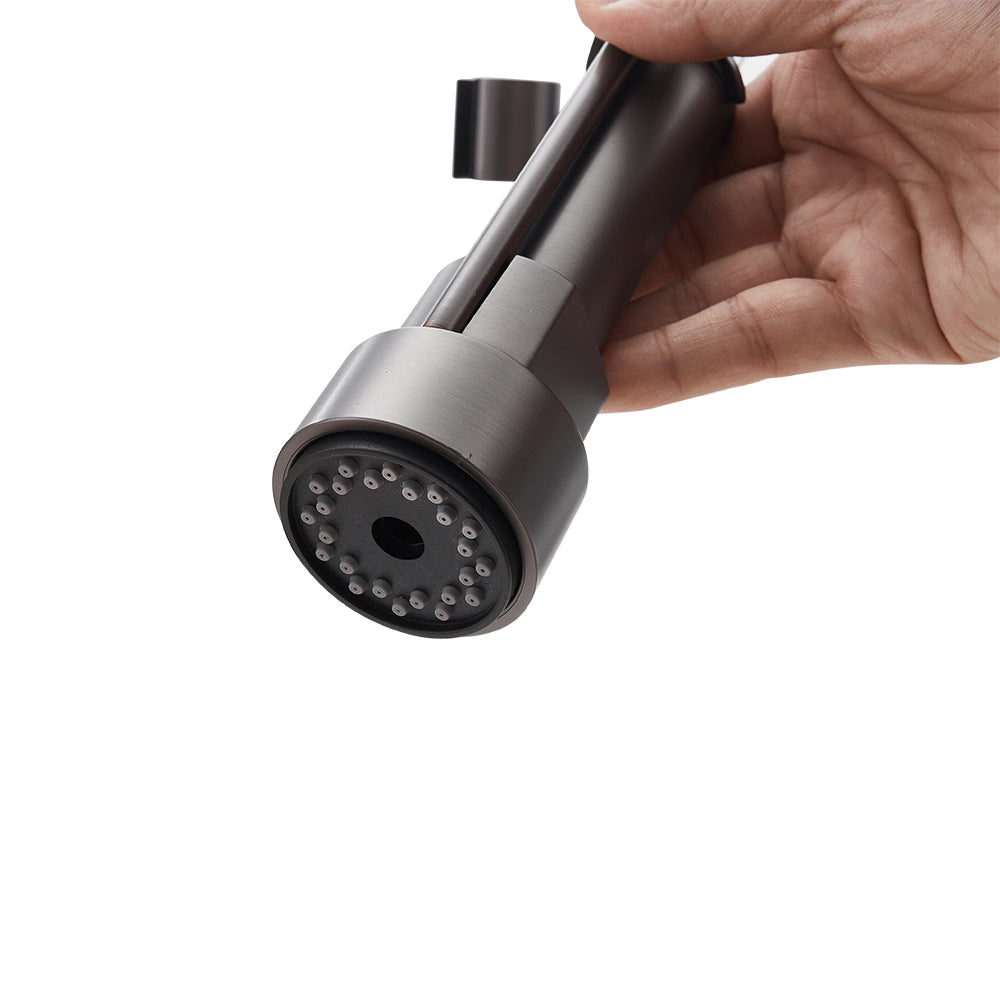 This kitchen faucet combines sleek design with practical functionality. Its contemporary finish and clean contours enhance any kitchen decor. Featuring both a pull-down sprayer and a pot filler, it offers flexible options for various cooking and cleaning needs. Each component rotates fully, allowing precise positioning to suit your tasks with ease.