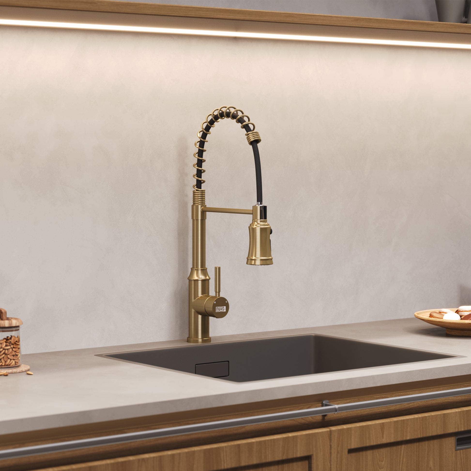 Enhance your kitchen efficiency with this single-handle faucet featuring a flexible spring spout that extends your reach for diverse tasks. Its adjustable design lets you direct water precisely to clean sink corners and remove food debris effectively. Complemented by a sleek curved silhouette and a premium finish, this faucet adds a refined, elegant touch to any kitchen environment.