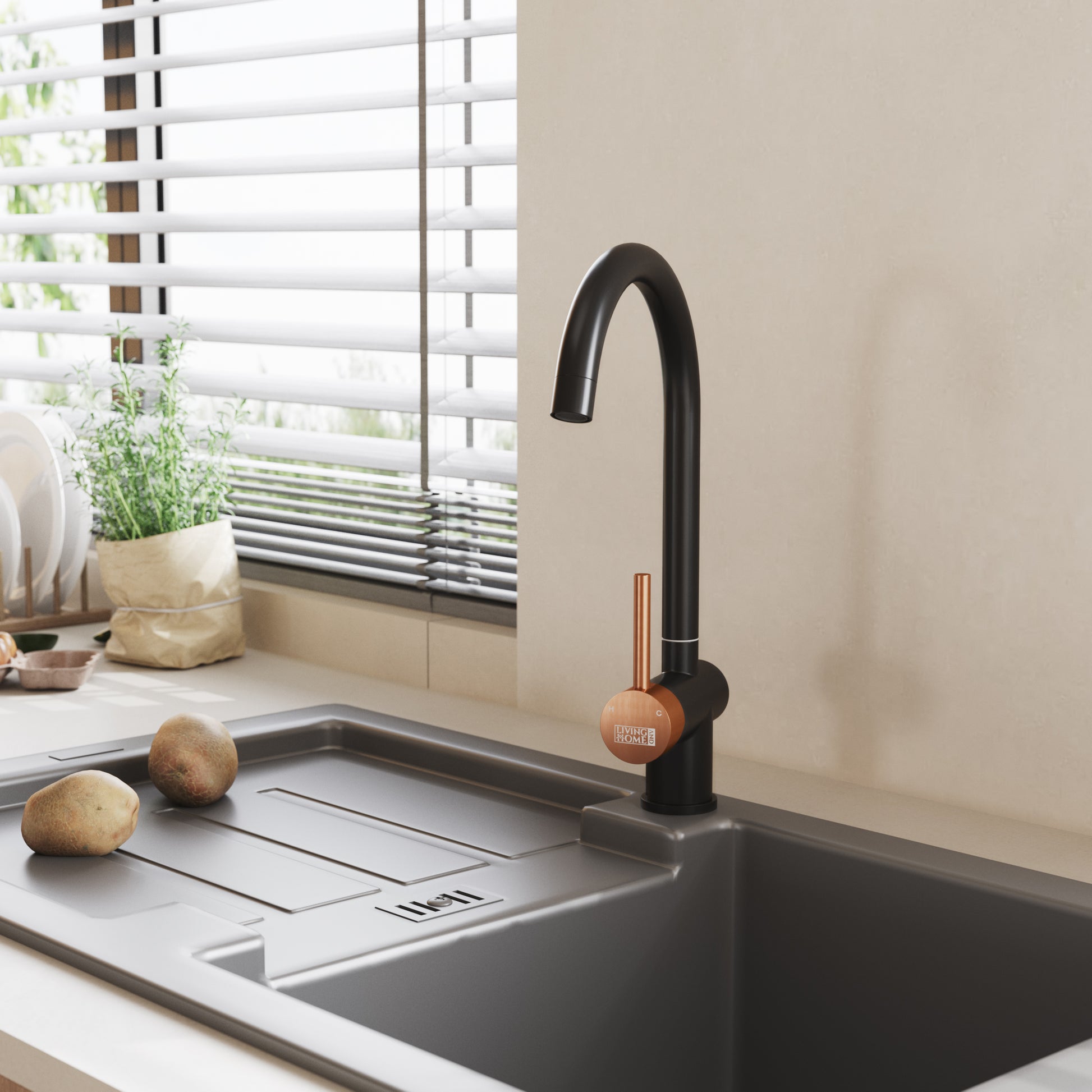 Designed for busy kitchens, this single-handle faucet combines exceptional performance with striking style. Its modern black and rose gold two-tone finish adds a sophisticated touch that stands out in any kitchen setting. The single lever allows precise one-handed control over water temperature and flow, while the swivel spout ensures convenient reach to every part of your sink, making daily kitchen tasks more efficient and effortless.
