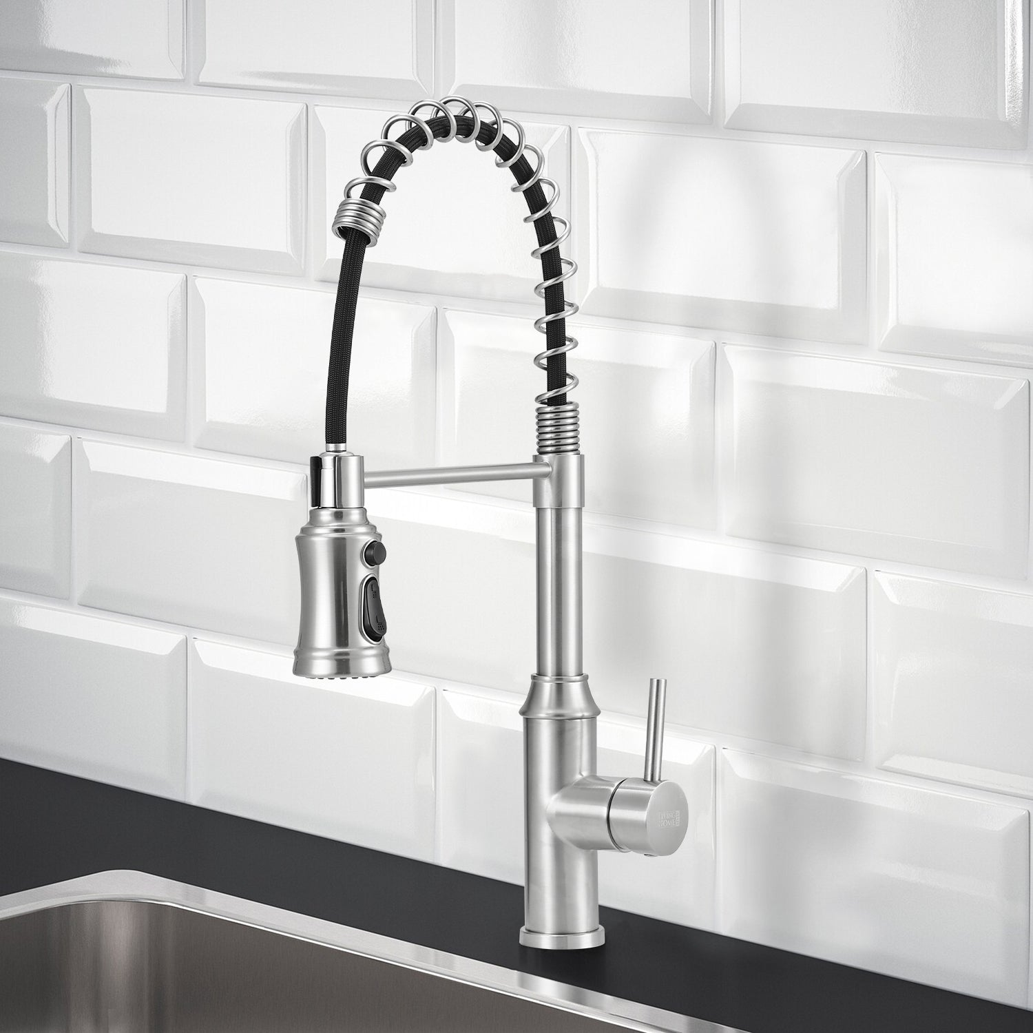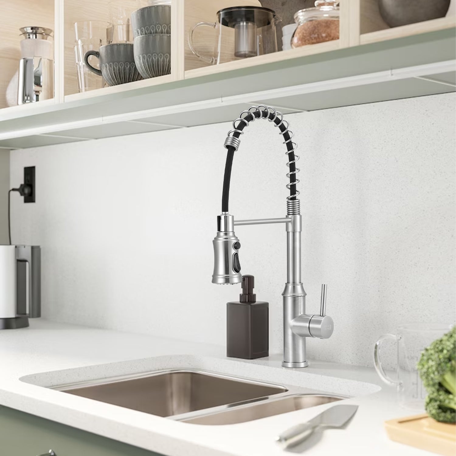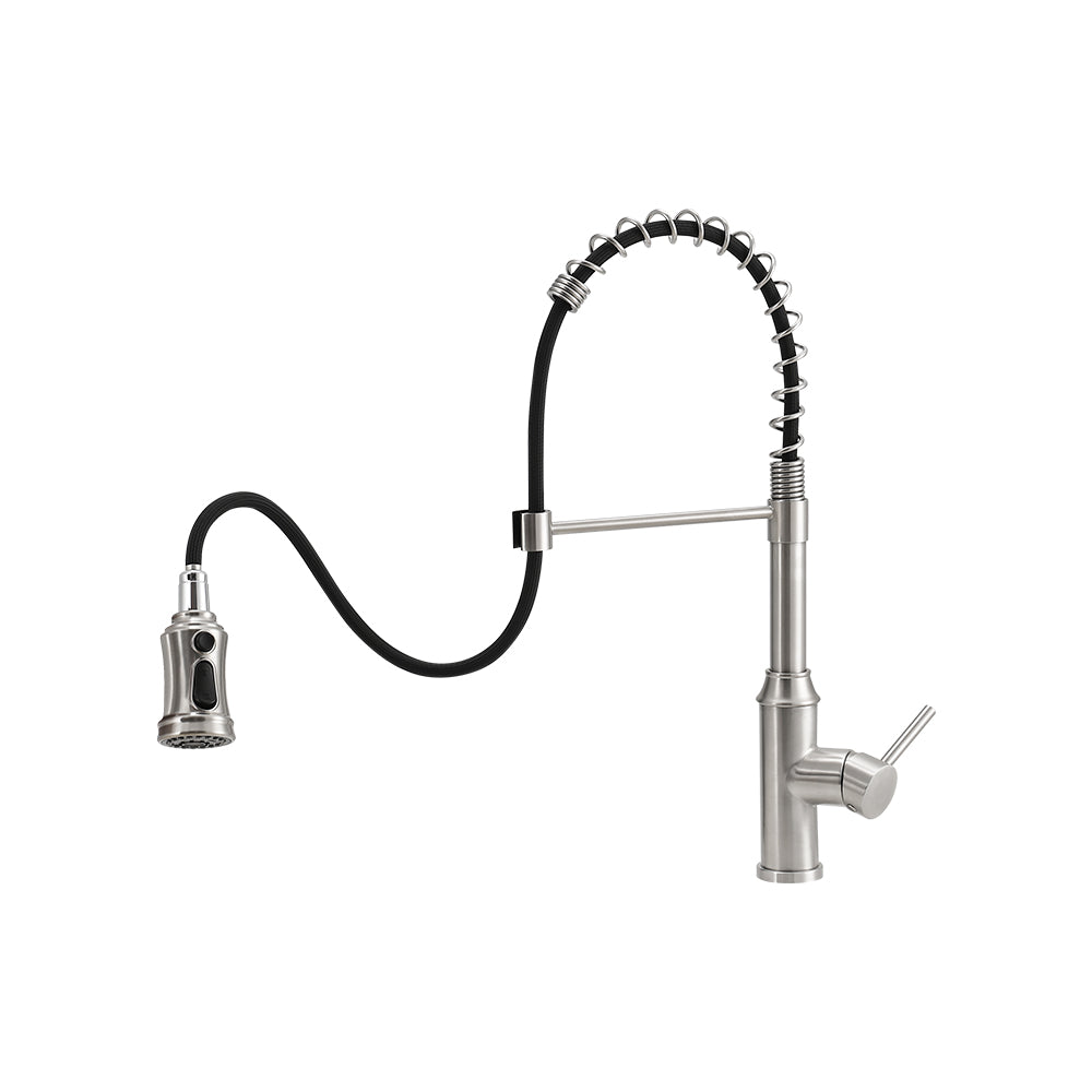 Elevate your kitchen functionality with this advanced swivel pulldown faucet featuring an exposed spring design that combines aesthetic appeal with practicality. Its high-arc spout provides ample space for washing large pots and pans efficiently. Constructed from high-quality stainless steel, it ensures long-lasting durability, resistance to water damage, and protection against rust and discoloration. Equipped with both full spray and aerated flow options, this faucet adapts seamlessly to various cleaning tasks.