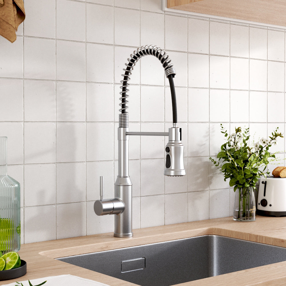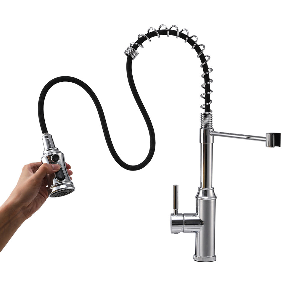 Elevate your kitchen functionality with this advanced swivel pulldown faucet featuring an exposed spring design that combines aesthetic appeal with practicality. Its high-arc spout provides ample space for cleaning large pots and pans efficiently. Constructed from high-quality stainless steel, it ensures long-lasting durability, resistance to water damage, and protection against rust and discoloration. Equipped with both full spray and aerated flow options, this faucet adapts seamlessly to various washing tasks.