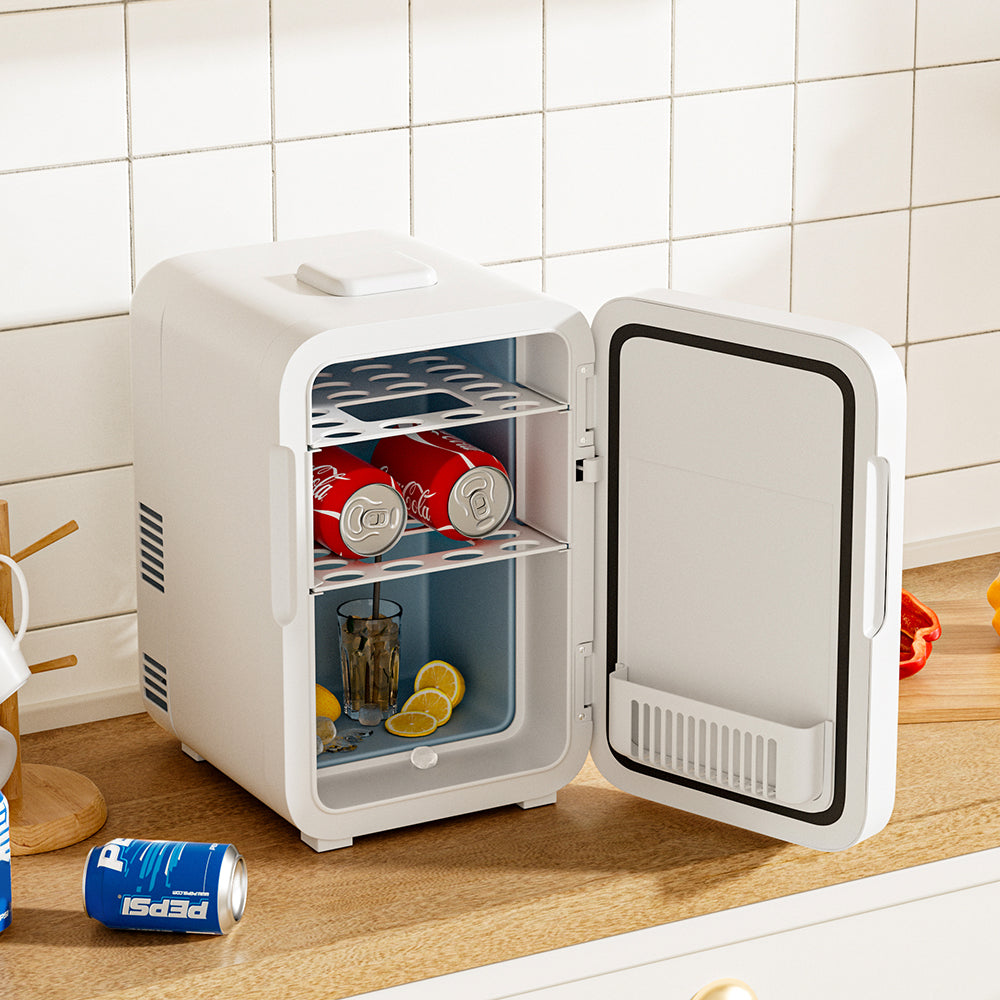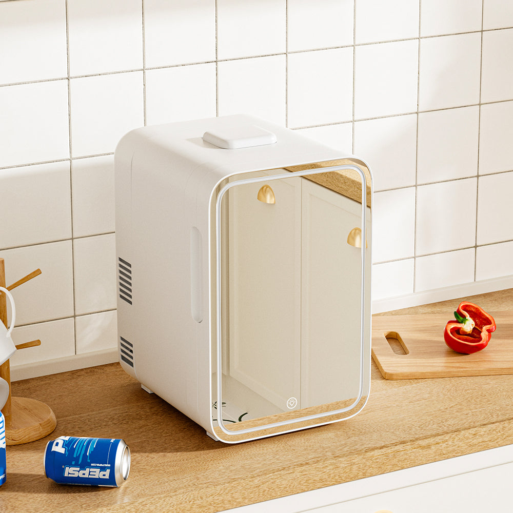 Keep your skincare and makeup organized and fresh with the White 12L Mini Fridge with LED Mirror Door. With 12 litres of storage capacity, this mini fridge features two adjustable shelves, an inner door storage basket, and an electronic thermostat that cools 26° C below ambient room temperature to help your products last longer. Its front door mirror with touch-activated LED light adds convenience and style to your vanity.