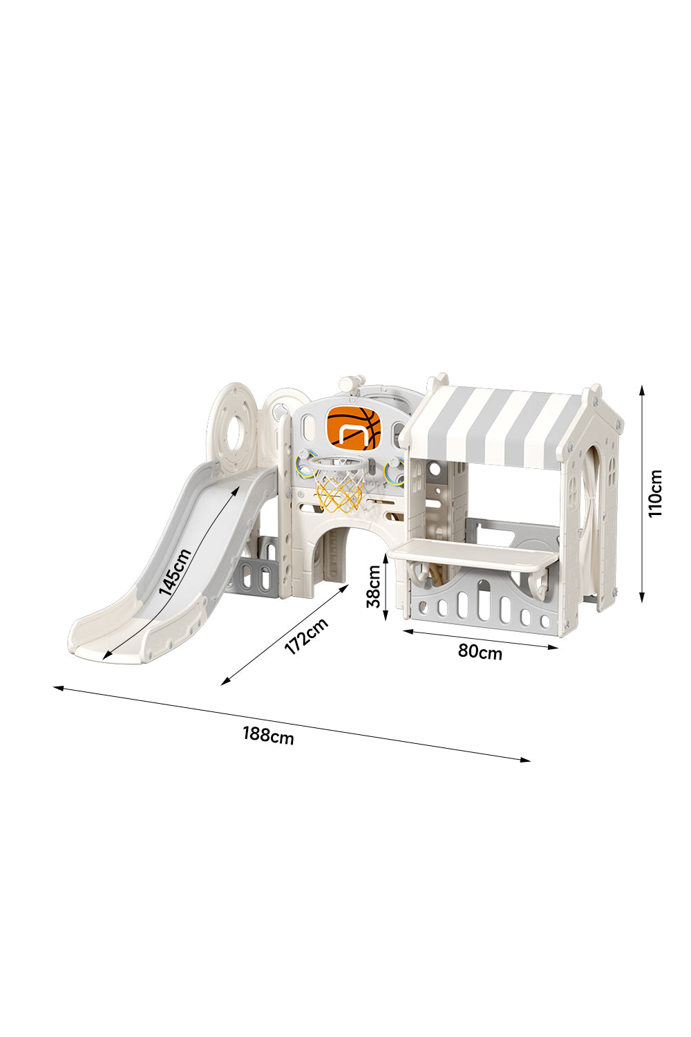 Discover the ultimate adventure hub for your little explorers - the Kidkid Toddler Slide Climber Playhouse Combo! Packed with exciting features, this playhouse integrates stairs, a slide, a deck, a house and a storage compartment. The little ones can have endless fun with the ring-toss game, basketball hoop and telescope. Set this playground up in the nursery or the living room, it is sure to ignite their imagination. Crafted from environmentally friendly HDPE and PP materials, it ensures safety while promoting active play and cognitive development. Elevate playtime today with Kidkid - where fun meets learning!