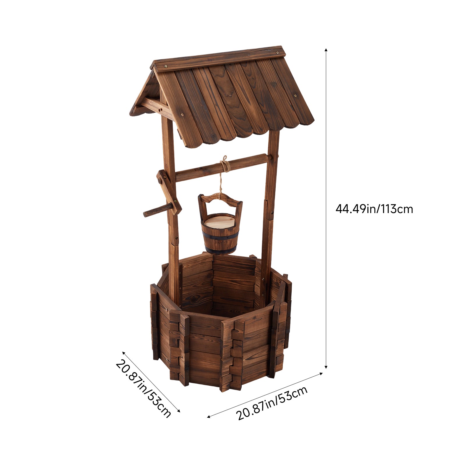 Embellish your garden, patio, or front yard with this wishing well planter, adding a charming, old-world touch. Mimicking a traditional well, it features a roof, crank handle, and water bucket, all crafted from natural spruce and pine wood, showcasing unique grain patterns. The mortise and tenon joint construction enhances strength and stability, while gaps between slats improve aeration for healthy plant growth. The open-bottom design ensures proper drainage, preventing waterlogging. Perfect for porches, gardens, or walkways, this planter elevates your outdoor space with rustic charm and functionality.