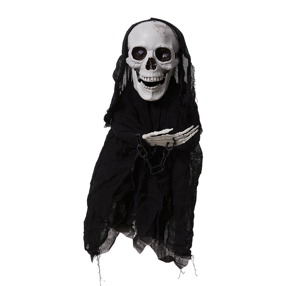 This voice-activated groundbreaking skeleton decoration, with its unique design and interactive features, adds endless fun to Halloween, parties, or any occasion seeking a thrilling atmosphere. Adorned with a classic black cloak and white skeleton design, it creates an ambiance that is both mysterious and slightly horrifying. Crafted from high-quality materials with a delicate surface treatment, the details are vividly lifelike. Simply insert the decoration in your patio or garden to bring surprises and laughter to your Halloween setting.