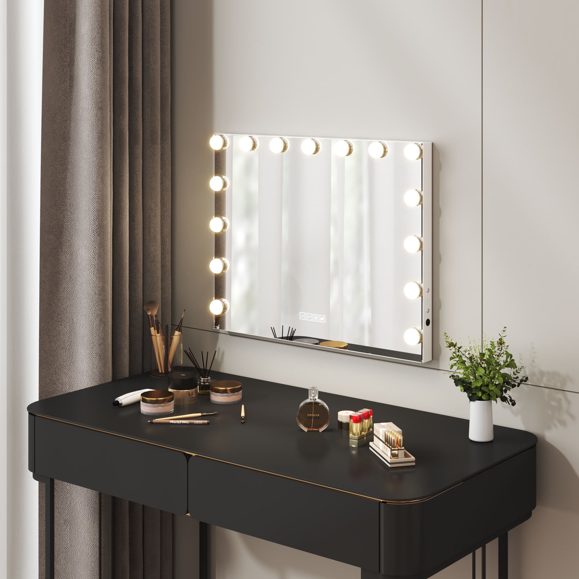 Improve your vanity table or dressing room with the stunning mirrored-edge finish of this Hollywood-style mirror. It features 15 LED bulbs, offering a lifespan of up to 50,000 hours and the option of warm, neutral, or cold light modes. The smart touch sensor allows for easy brightness control and the mirror can also connect to Bluetooth devices. Make your makeup routine a breeze with this illuminated mirror.