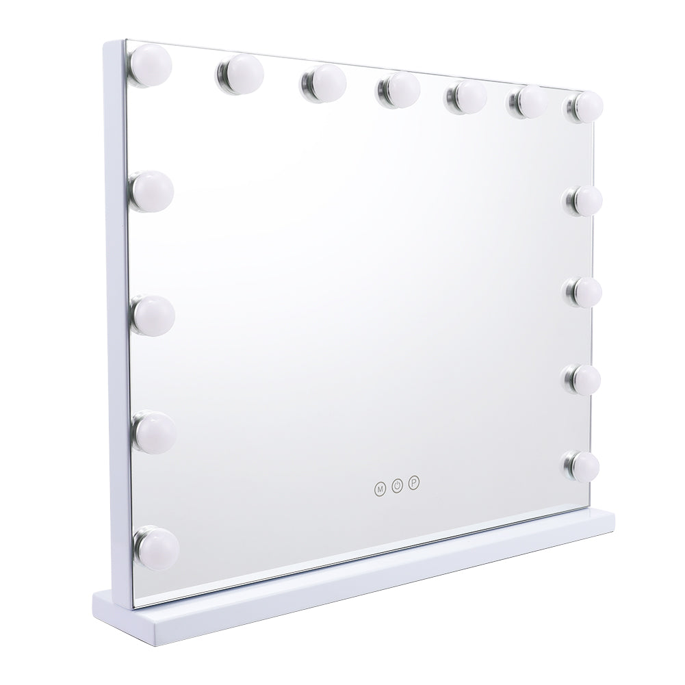 This Hollywood-style vanity mirror offers professional-grade performance with advanced touch screen controls and 15 dimmable LED lights for superior lighting. Its detachable base provides flexible placement options, allowing it to be wall-mounted or used on a tabletop. Made from high-quality materials, the mirror ensures excellent clarity and true-to-life color accuracy, supporting precise and confident makeup application.