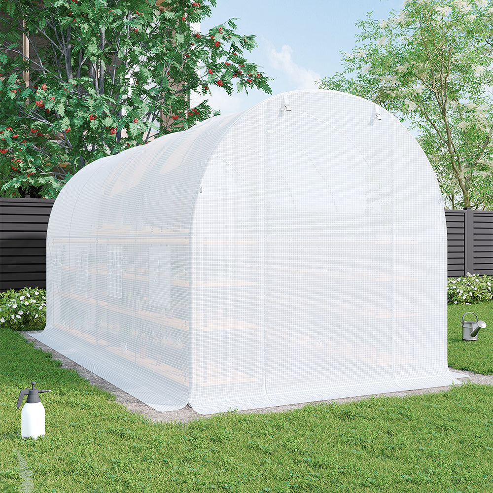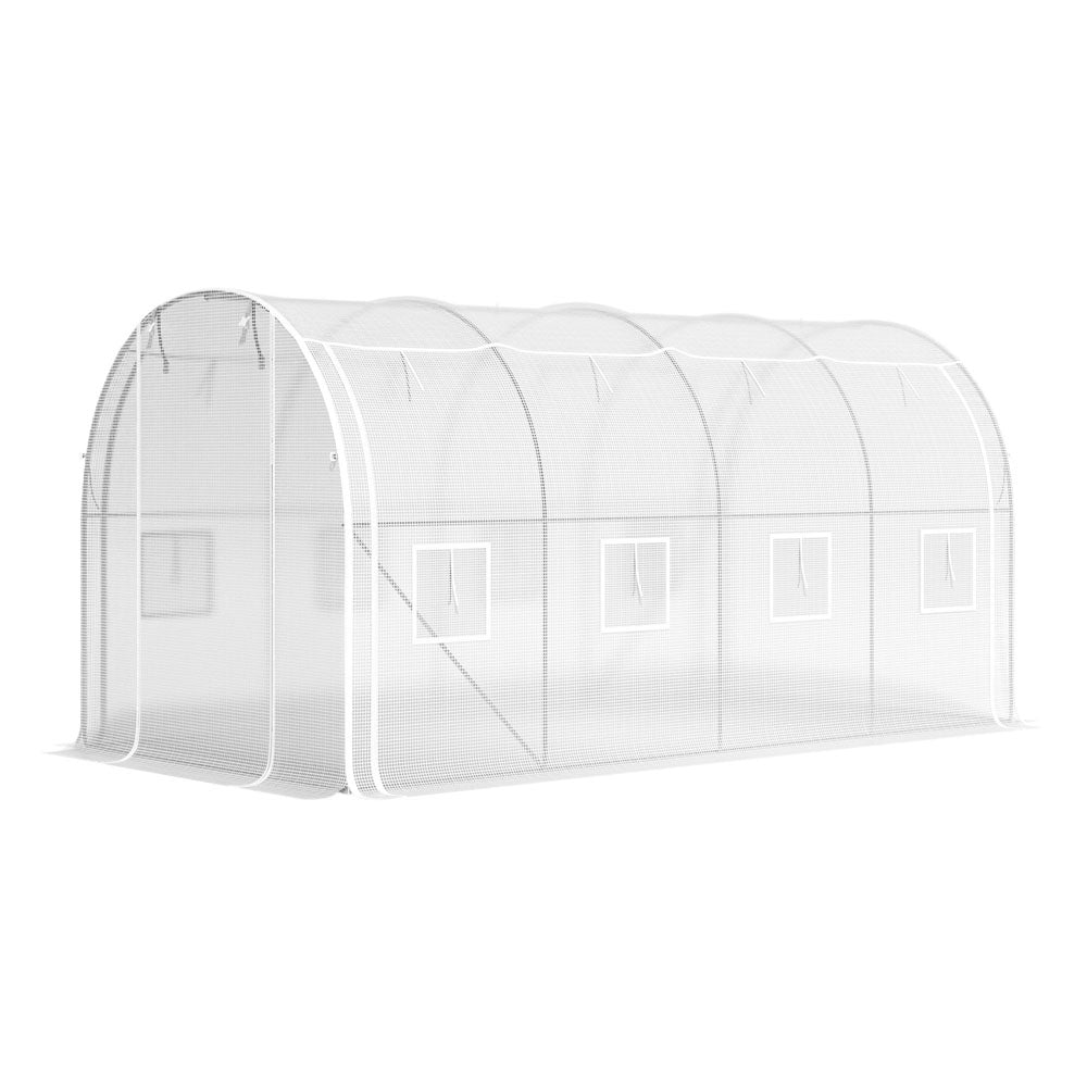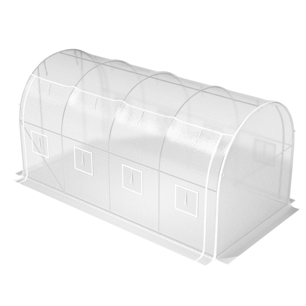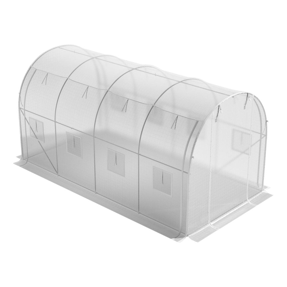 Enhance your plants' growth with this White Outdoor Walk-in Tunnel Greenhouse. With a spacious layout, durable steel frame, and PE cover, your plants will thrive with ideal conditions of temperature, humidity, and sunlight. The roll-up windows and doors provide easy access and adjustable airflow, while also protecting your plants from inclement weather. Perfect for tending to your plants anytime.