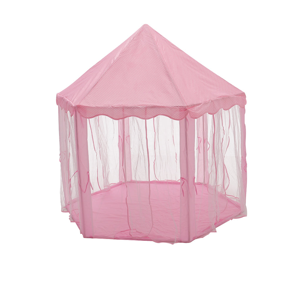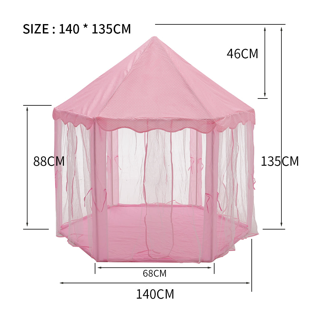 Create an enchanting play environment for your child with this charming kids' play tent. Featuring a hexagonal shape in soft pink with white polka dots, it evokes a whimsical and inviting feel. The distinctive cone-shaped roof and scalloped edges enhance its playful design. This versatile tent offers a safe space for imaginative activities and doubles as a cozy sleeping nook when used with bedding. Lightweight and easy to assemble, it is perfect for indoor use or outdoor adventures at the park, beach, or campsite.